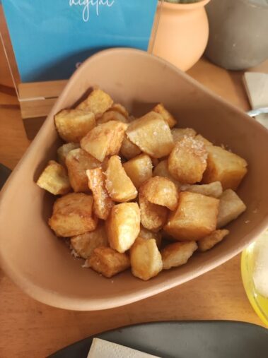 Con la bebida nos pusieron unas papas que parecían caseras (muy buenas) y unas aceitunas. La camarera muy amable en todo momento, nos aconsejó algunos aperitivos, y pedimos unas bravas.